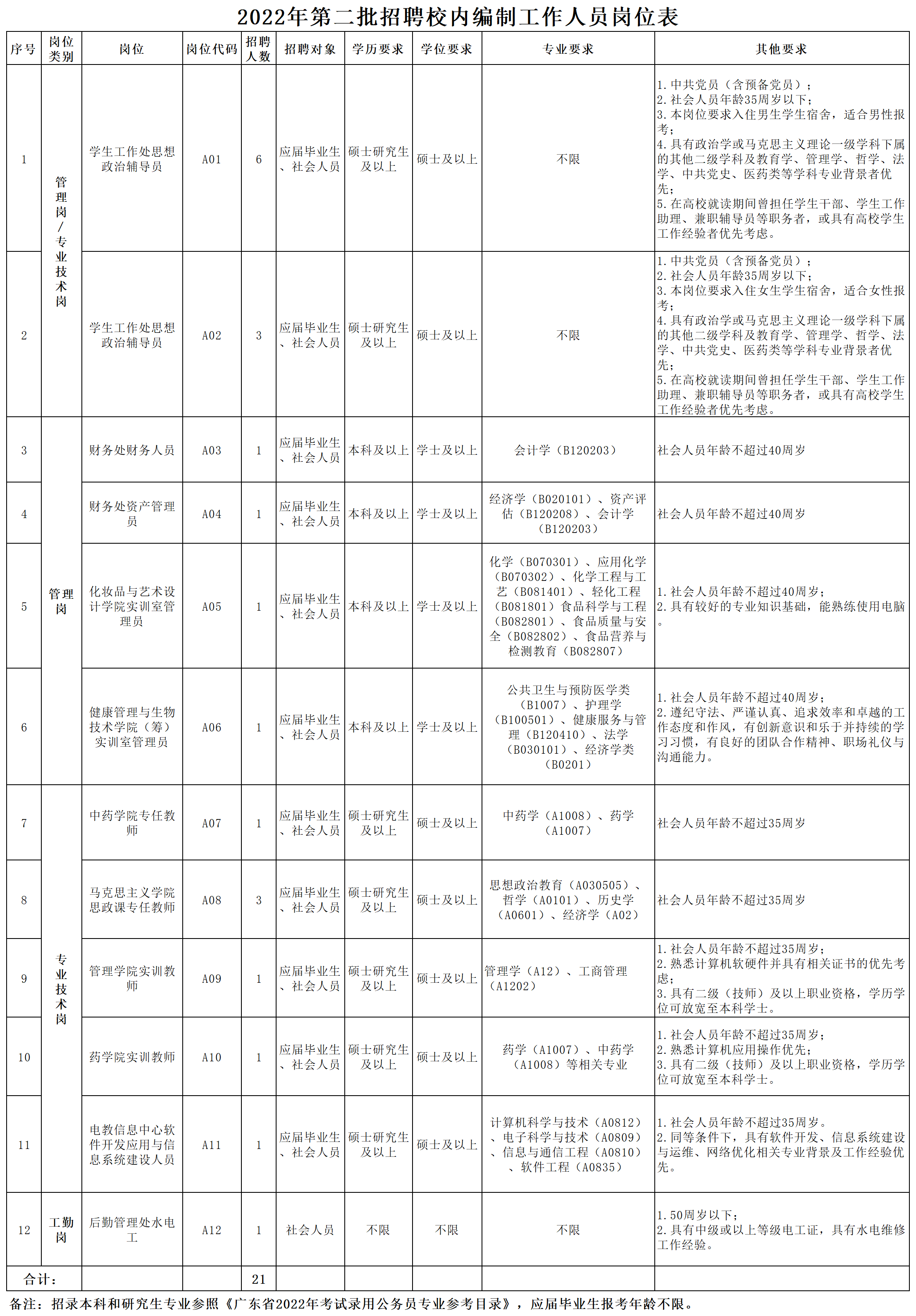 广东食品药品职业学院关于2022年第二批公开招聘校内编制工作人员的公告