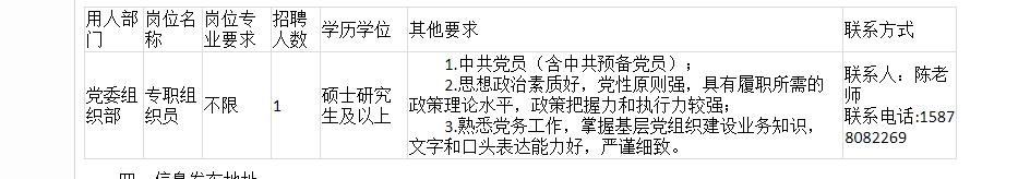 党委组织部 | 专职组织员 | 不限 | 1 | 硕士研究生及以上 | 1.中共党员(含中共预备党员); 2.思想政治素质好,党性原则强,具有履职所需的政策理论水平,政策把握力和执行力较强; 3.熟悉党务工作,掌握基层党组织建设业务知识,文字和口头表达能力好,严谨细致。 | 联系人:陈老师 |