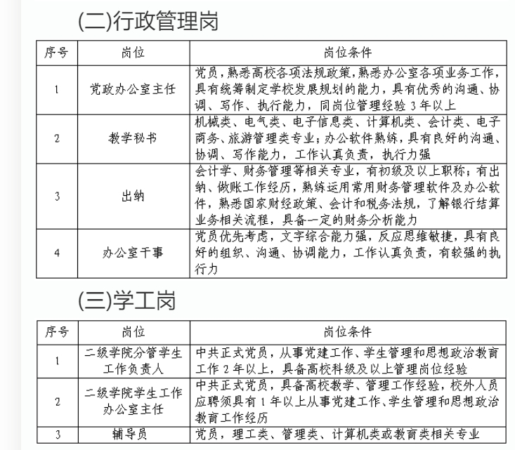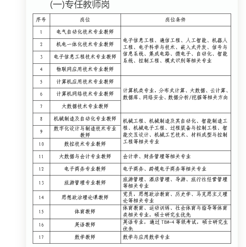 5.专任教师岗具有岗位所需专业或技能条件,具有高校教学经验、中级以上专业技术职务或具有行业、企业工作经历优先考虑,条件可适当放宽;